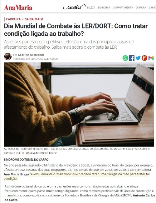 Em reportagem da Revista Ana Maria, o presidente da Sociedade Brasileira de Cirurgia da Mão (SBCM), Antonio Carlos da Costa, explicou sobre lesões que podem estar relacionadas ao trabalho. A Síndrome do Túnel do Carpo, Sinovite e Tenossinovite foram alguns dos problemas esclarecidos pelo especialista.