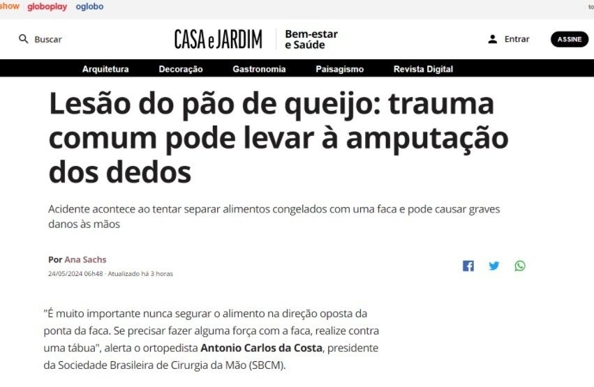 Especialistas da SBCM falam sobre traumas causados pela lesão da "Mão do Pão de Queijo", em matéria da Revista Casa e Jardim