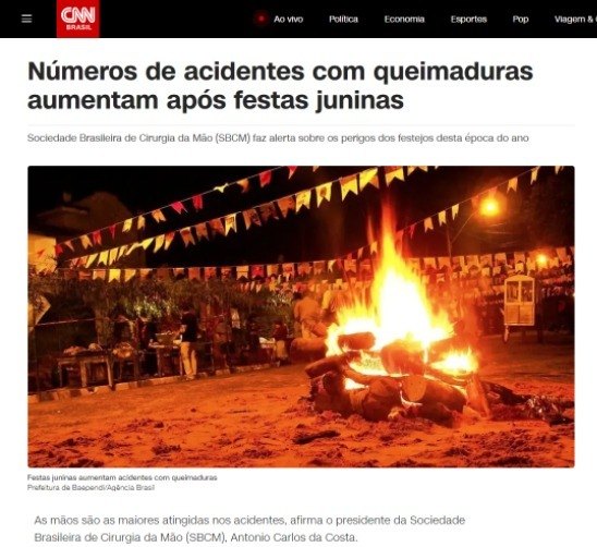 O portal da CNN Brasil traz reportagem com importante alerta da Sociedade Brasileira de Cirurgia da Mão (SBCM) sobre os riscos de queimaduras provocadas por fogos de artifício durante os festejos de São João, que vão se estender pelo mês de julho. O presidente da SBCM, Antonio Carlos da Costa, lembrou que as mãos costumam ser as áreas mais atingidas por esse tipo de acidente.