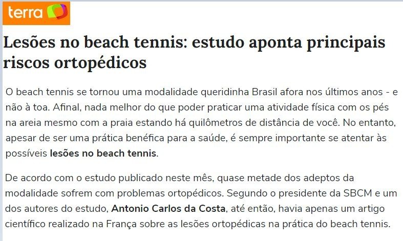 O portal Terra destacou estudo sobre lesões no beach tennis, que tem como um dos autores o presidente da Sociedade Brasileira de Cirurgia da Mão (SBCM), Antonio Carlos da Costa.