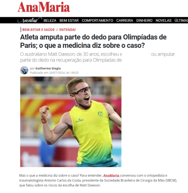 Em matéria publicada na Revista Ana Maria, o presidente da Sociedade Brasileira de Cirurgia da Mão (SBMC), Dr. Antonio Carlos da Costa, falou sobre questões relacionadas à amputação de membro, em repercussão ao caso do jogador australiano de hóquei, Matt Dawson, que, após sofrer uma fratura, decidiu amputar parte do dedo para participar das Olimpíadas de Paris 2024.