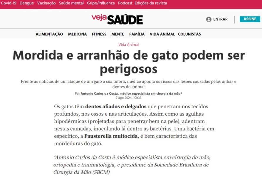 O presidente da SBCM, Antonio Carlos da Costa, assinou artigo na VEJA SAÚDE, que repercutiu o caso de um gato que ataca com frequência sua tutora, em São Vicente (SP), chegando a dilacerar suas mãos.