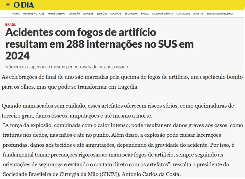 Confira a matéria na íntegra: https://odia.ig.com.br/brasil/2024/12/6972688-acidentes-com-fogos-de-artificio-resultam-em-288-internacoes-no-sus-em-2024.html