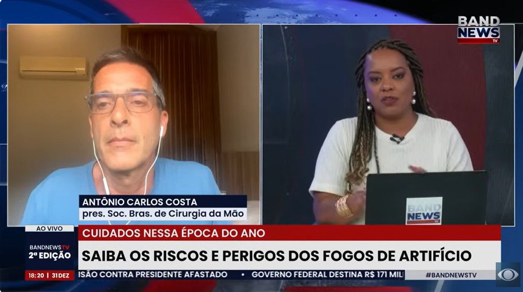 Em entrevista ao programa BandNews, o Dr. Antonio Carlos Costa, presidente da Sociedade Brasileira de Cirurgia da Mão (SBCM), destacou os perigos que os fogos de artifício representam para a saúde das mãos. Ele reforçou a importância de agir rapidamente em caso de acidentes: "A primeira medida, em caso de trauma causado por fogos de artifício, é lavar a área afetada com água corrente, cobrir com um pano limpo e buscar atendimento médico imediatamente, preferencialmente com um especialista em mãos", orientou.