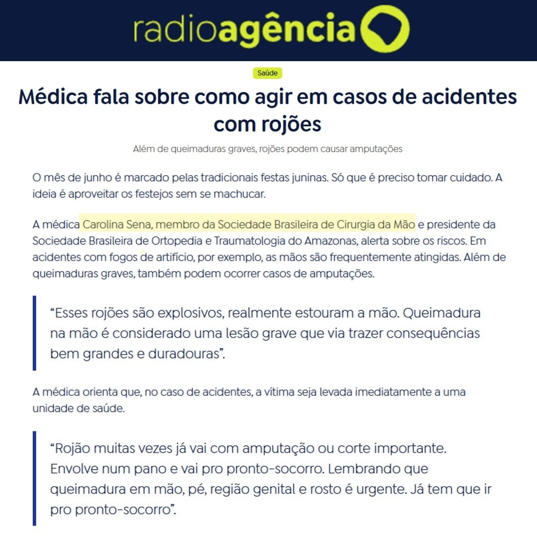 Com a chegada das festas juninas, os acidentes com fogos de artifício preocupam, principalmente pelas lesões nas mãos. A Dra. Carolina Sena, membro da SBCM, explicou à Agência Brasil os riscos envolvidos e o que fazer em caso de queimaduras ou amputações.