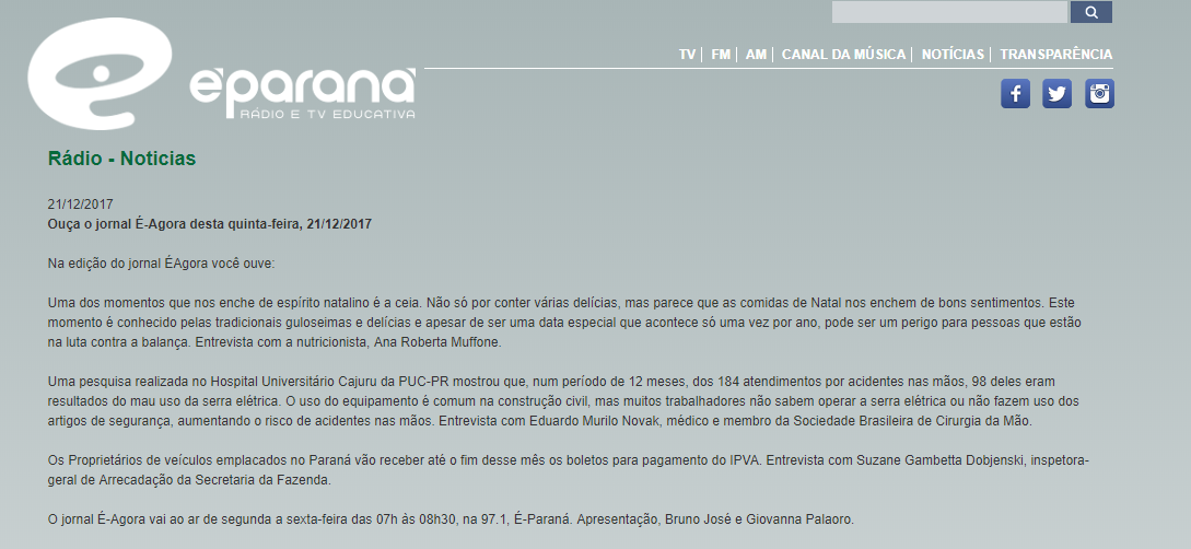Fonte: Jornal É-AgoraO membro da Sociedade Brasileira de Cirurgia da Mão, Dr. Eduardo Novak, participou do jornal ÉAgora da rádio Educativa do Paraná. A entrevista foi sobre acidentes nas mãos que acontecem através do mau uso das serras elétricas.