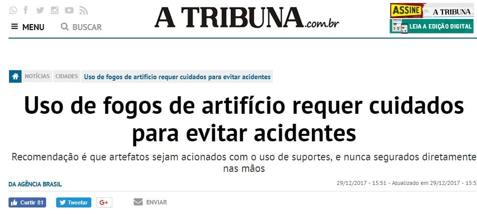 Fonte: A TribunaO uso de fogos de artifício na virada do ano é uma tradição admirada por muitas pessoas em todo o mundo. Mas a prática requer cuidados para evitar acidentes que podem causar queimaduras, mutilações e até a morte.