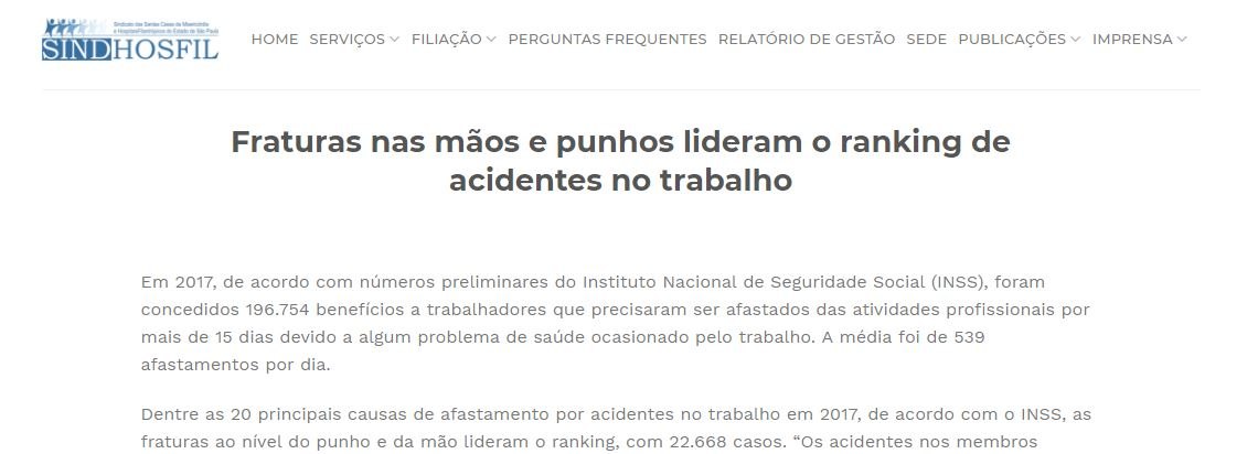 Fonte: SINDHOSFIL/SPEm 2017, de acordo com números preliminares do Instituto Nacional de Seguridade Social (INSS), foram concedidos 196.754 benefícios a trabalhadores que precisaram ser afastados das atividades profissionais por mais de 15 dias devido a algum problema de saúde ocasionado pelo trabalho. A média foi de 539 afastamentos por dia.