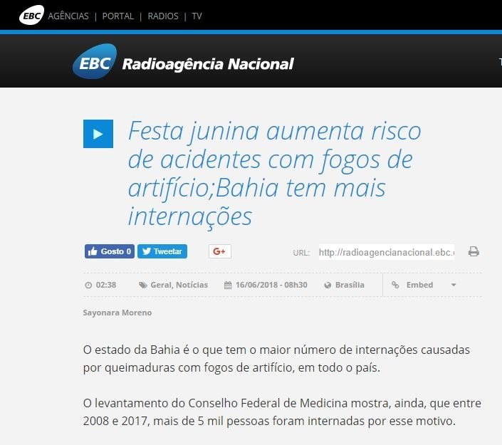Fonte: Rádio NacionalO estado da Bahia é o que tem o maior número de internações causadas por queimaduras com fogos de artifício, em todo o país.