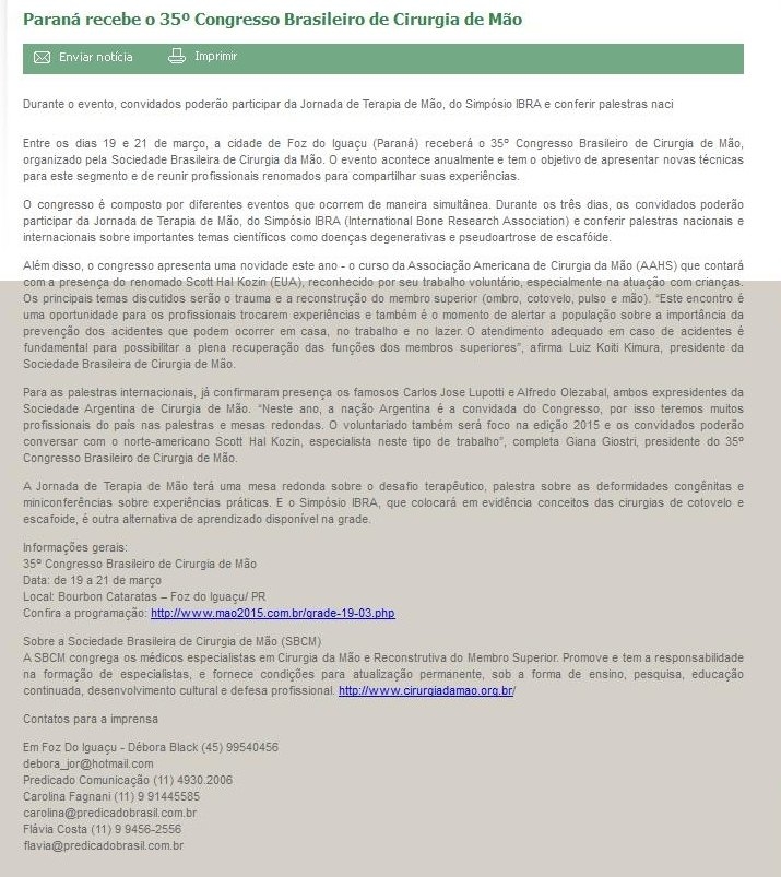 Fonte: MaxpressnetEntre os dias 19 e 21 de março, a cidade de Foz do Iguaçu (Paraná) receberá o 35º Congresso Brasileiro de Cirurgia de Mão, organizado pela Sociedade Brasileira de Cirurgia da Mão. O evento acontece anualmente e tem o objetivo de apresentar novas técnicas para este segmento e de reunir profissionais renomados para compartilhar suas experiências.