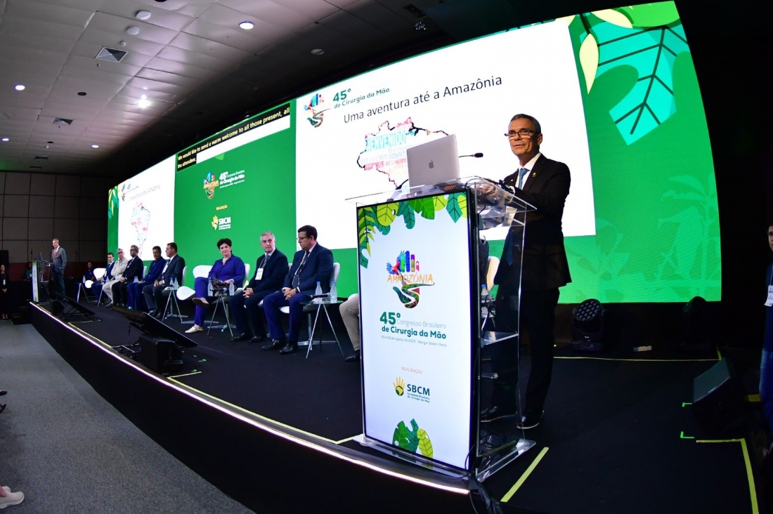 O Amãozônia teve os trabalhos oficialmente abertos em cerimônia especial realizada no fim da tarde desta quinta-feira (21). A mesa foi composta pelo Dr. Rui Sergio Monteiro de Barros, presidente da SBCM e do 45º Congresso Brasileiro de Cirurgia da Mão; pela Dra. Heloisa Guimarães, secretária adjunta de Gestão de Política de Saúde e que representou a Dra. Ivete Gadelha Vaz, secretária de Estado de Saúde de Belém; pelo Dr. João Baptista Gomes dos Santos, presidente de Honra do 45º CBCM; e Dr. Jean Klay Santos Machado, 2º secretário da SBOT, representando o Dr. Paulo Lobo, presidente da SBOT. A Diretoria da SBCM também esteve presente, com o Dr. Roberto Luiz Sobania, vice-presidente da SBCM e próximo presidente da entidade; Dr. Teng Hsiang Wei, 2º vice-presidente; Dr. Luis Renato Nakachima, 1º secretário; Dr. Antonio Barbosa Chaves, 2º Secretário da SBCM; Dr. Diego Figueira Falcochio, tesoureiro; Dr. Sandro Castro Adeodato de Souza, diretor de Integração das Regionais; Dr. Luiz Garcia Mandarano Filho, diretor de Comunicação e Dr. Paulo Randal Pires Junior, presidente da Comissão de Educação Continuada.