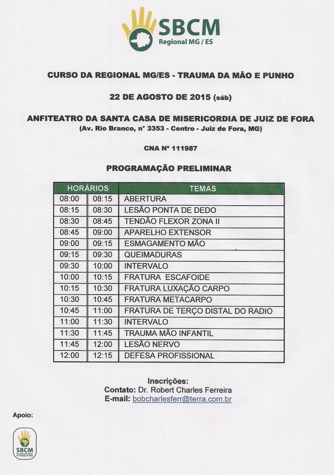 No próximo dia 22 de agosto, a Sociedade Brasileira de Cirurgia de Mão - Regional de MG/ES vai realizar um curso sobre o tema Trauma da mão e Punho, na Santa Casa de Misericórdia de Juíz de Fora.