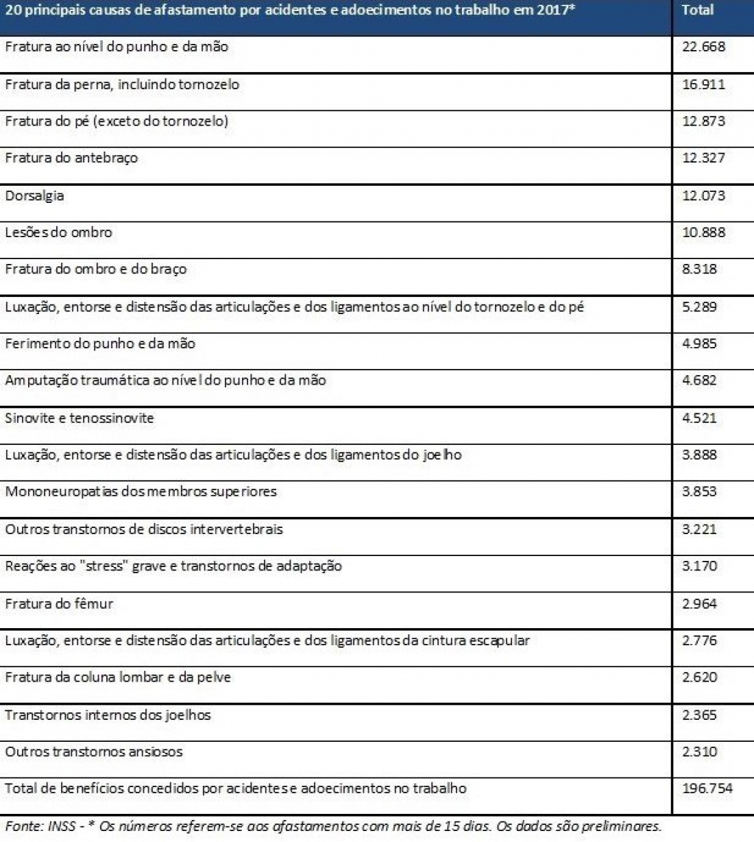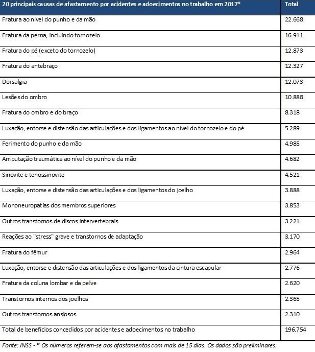 Em 2017, de acordo com números preliminares do Instituto Nacional de Seguridade Social (INSS), foram concedidos 196.754 benefícios a trabalhadores que precisaram ser afastados das atividades profissionais por mais de 15 dias devido a algum problema de saúde ocasionado pelo trabalho. A média foi de 539 afastamentos por dia.