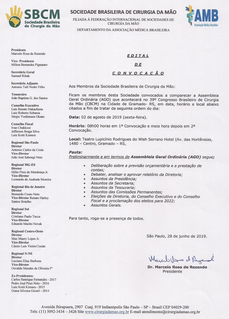 A Diretoria da Sociedade Brasileira de Cirurgia da Mão comunica que estarão abertas as inscrições de chapas para eleições da Diretoria, Conselho Executivo, Conselho Fiscal e Diretores e Vices das Regionais da SBCM Gestão 2022. As eleições serão realizadas no 39º Congresso Brasileiro de Cirurgia da Mão. Os interessados deverão inscrever suas chapas de 18 de junho a 18 de julho de 2019, conforme rege o Estatuto (http://www.cirurgiadamao.org.br/estatuto.php) e o Regimento Eleitoral (www.cirurgiadamao.org.br/regimento-eleitoral.php).