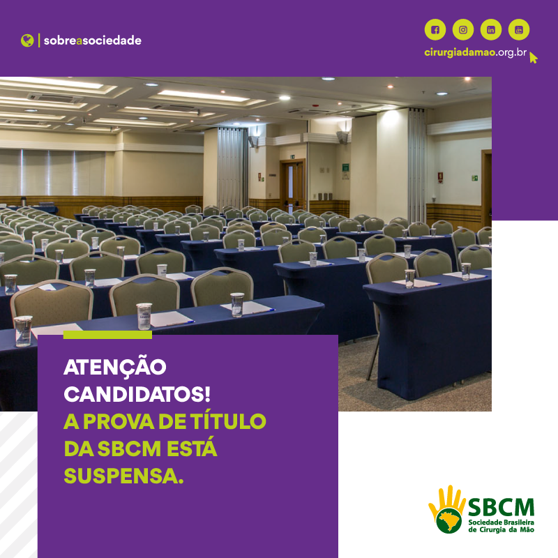 A SBCM (Sociedade Brasileira de Cirurgia da Mão), informa que o Exame de Suficiência para o Título de Especialista em Cirurgia da Mão programado para o dia 21 de março, em São Paulo (SP) está suspenso.
