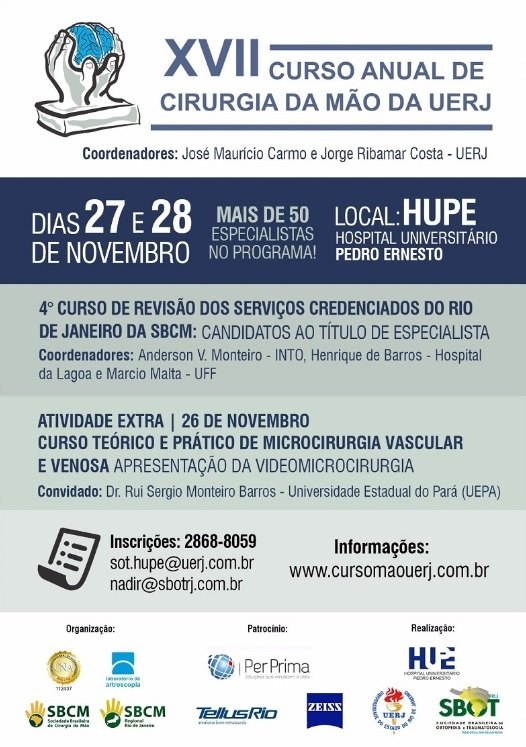 Entre os dias 27 e 28 de novembro, acontecerá o XVII Curso anual de Cirurgia da Mão da UERJ.