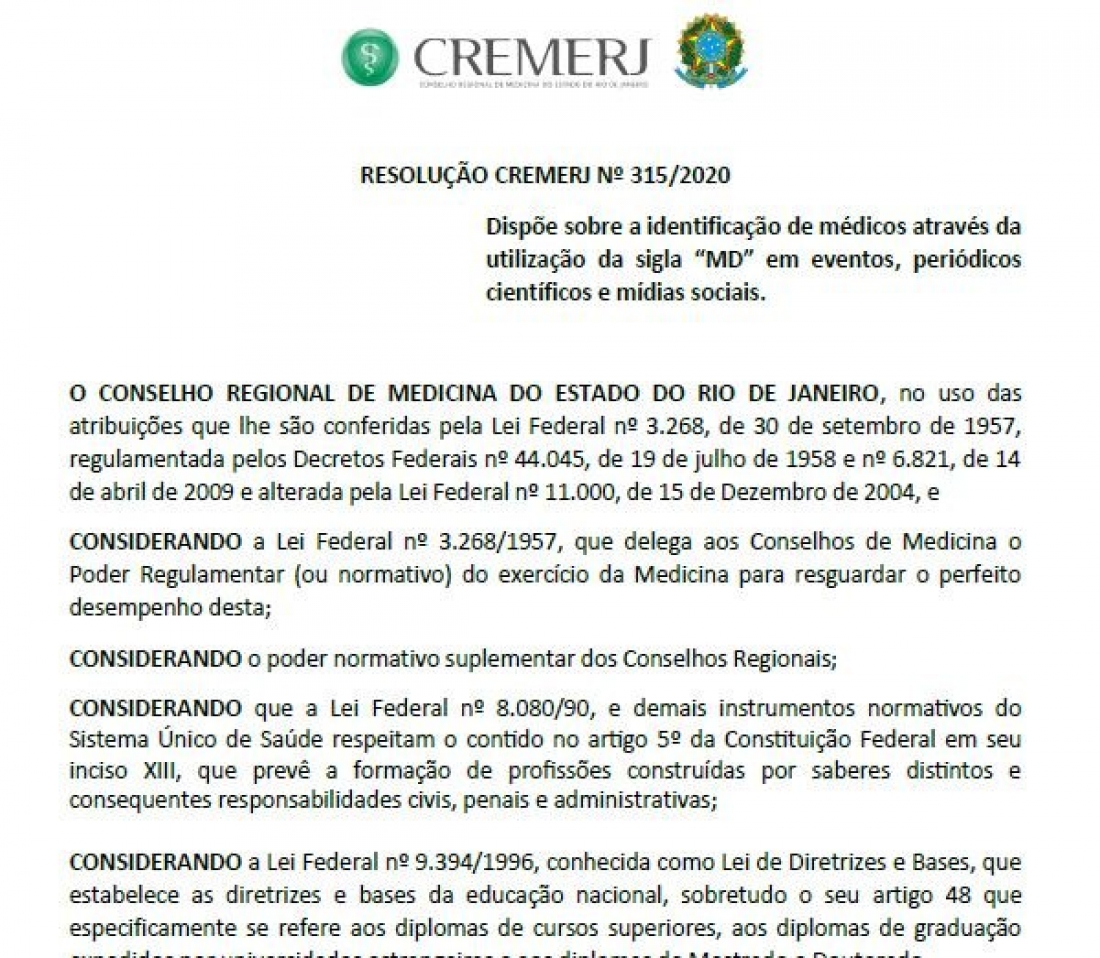 De acordo com a Resolução Nº 315/2020, instituída pelo Conselho Regional de Medicina do Estado do Rio de Janeiro – CREMERJ, a identificação de médicos através da utilização da sigla “MD” (Médico Diplomado) em eventos, publicações científicas e mídias sociais é permitida.