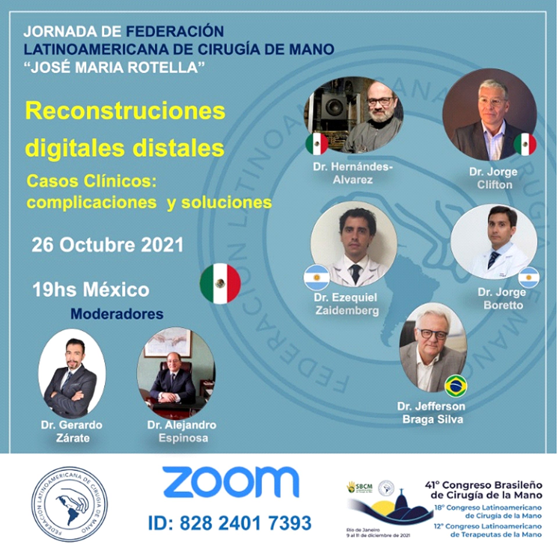 No dia 26 de outubro, a Federacíon Latinoamericana de Cirugía de Mano (FLACM) promoverá a Jornada de Federacíon Latinoamericana de Cirugía de Mano “José Maria Rotella”. O webinar abordará reconstruções digitais distais, com a apresentação de casos clínicos e a discussão de complicações e soluções.