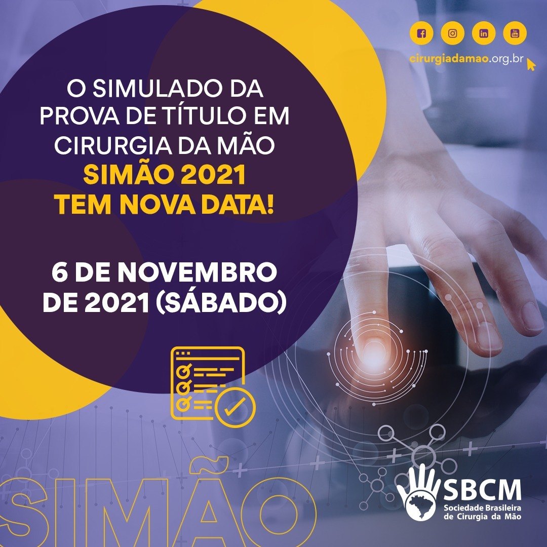 A Sociedade Brasileira de Cirurgia da Mão (SBCM), por meio da Comissão de Ensino e Treinamento, convidam a todos os Residentes de Cirurgia da Mão a participarem do SIMÃO 2021 – Simulado da Prova de Título em Cirurgia da Mão, que ocorrerá no dia 06 de novembro de 2021, sábado.