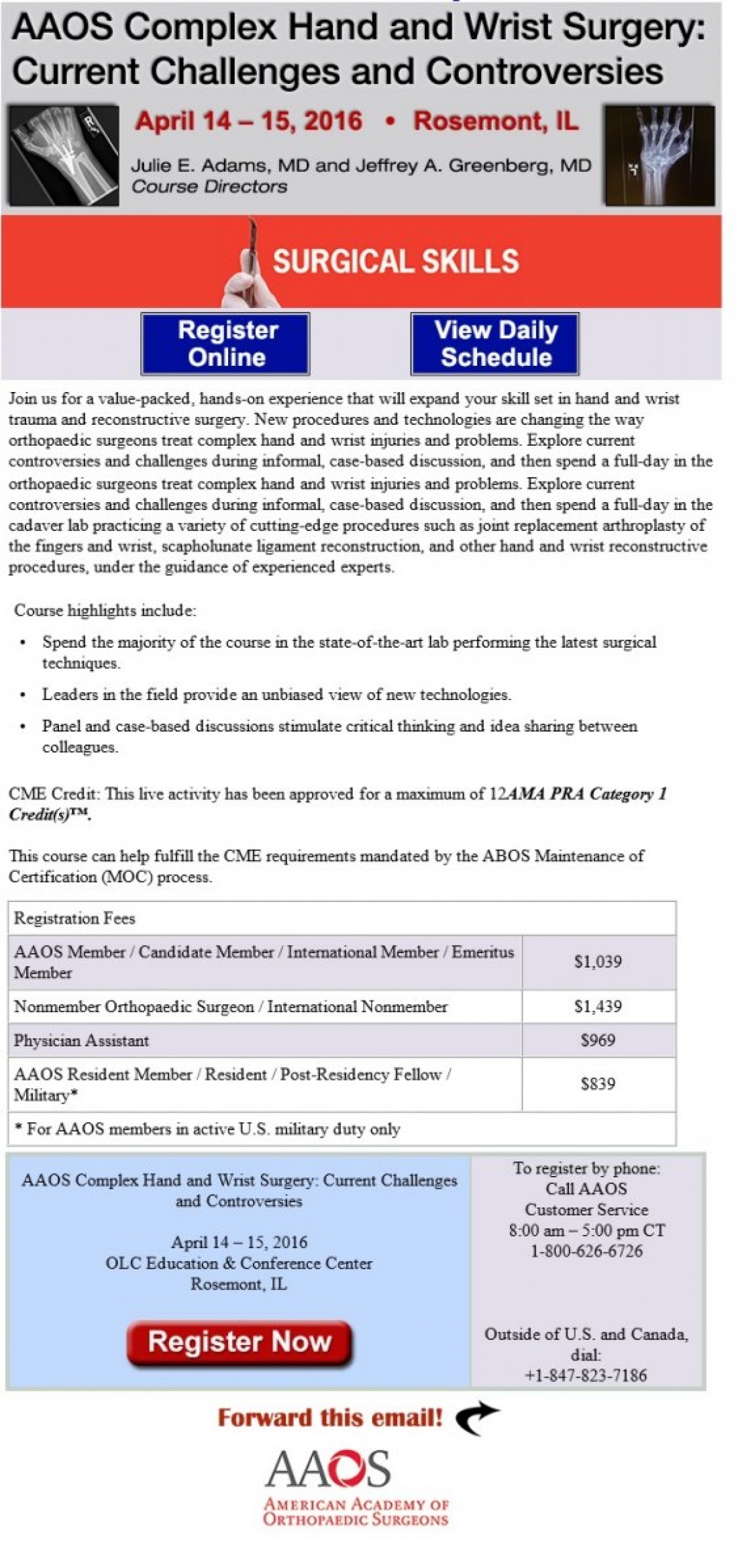 Comunicado da Dra Julie Adams sobre o curso de cirurgia complexa de mão e punho, que será realizado no mês de abril, em Chicago.