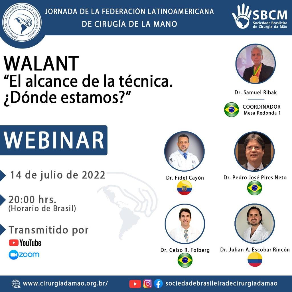 Na próxima quinta-feira, dia 14 de julho, às 20 horas, acontece o webinar WALANT “El alcance de la técnica. ¿Dónde estamos?” (WALANT “O alcance da técnica. Onde estamos?”). A live faz parte da Jornada de la Federación Latinoamericana de Cirugía de la Mano, e será transmitida pelas plataformas YouTube e Zoom.