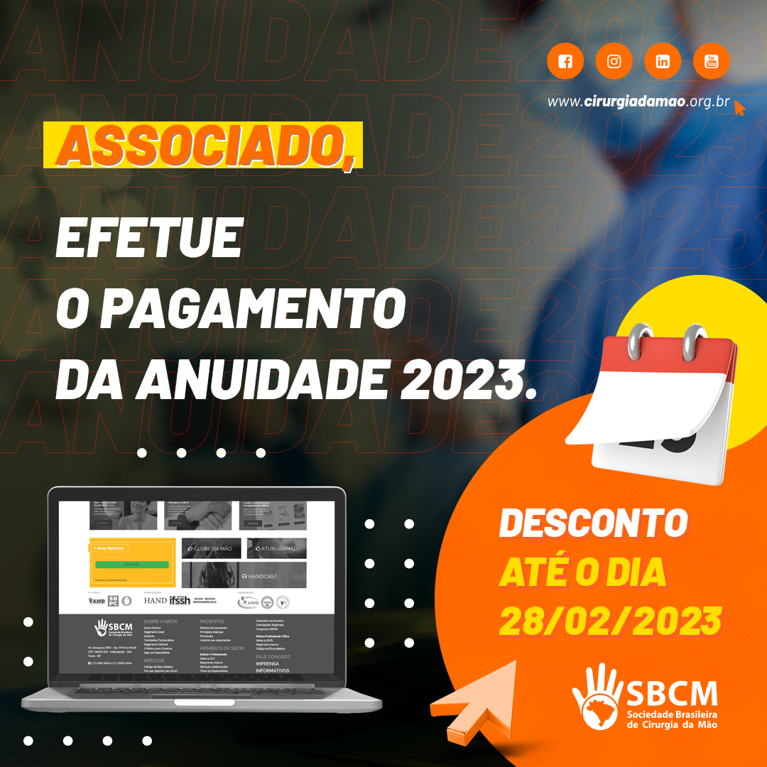 A Anuidade 2023 da Sociedade Brasileira de Cirurgia da Mão terá vencimento no dia 15 de março. Para os associados que efetuarem o pagamento até o dia 28 de fevereiro, haverá um desconto especial. O pagamento da anuidade deve ser feito pelo site da SBCM.