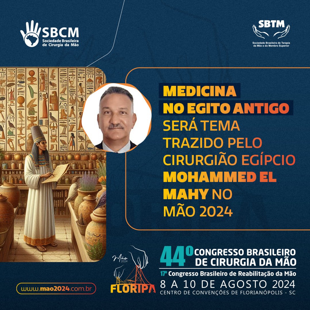 O 44º Congresso Brasileiro de Cirurgia da Mão é um evento de destaque no cenário médico nacional e internacional. Com presença confirmada de delegação de cirurgiões do Egito, um dos especialistas que compartilhará sua vasta experiêcia será o Dr. Mohammed El Mahy, membro proeminente da Sociedade Americana de Cirurgia da Mão, Sociedade Americana de Nervo Periférico e da AO Trauma Internacional.