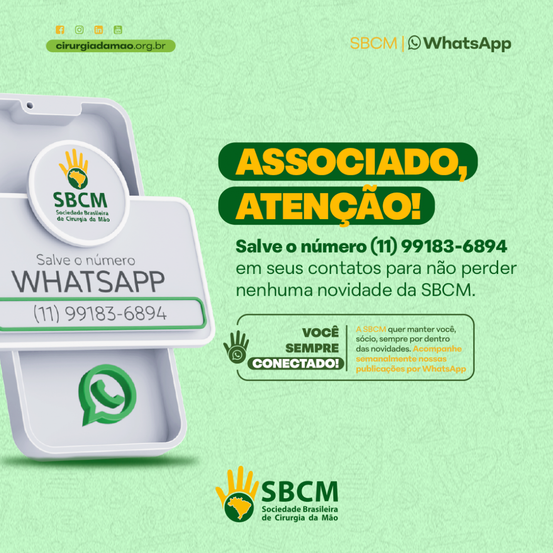 A Sociedade Brasileira de Cirurgia da Mão (SBCM) está sempre buscando manter seus associados informados sobre todas as atividades e eventos realizados pela entidade. Para garantir o recebimento dessas informações, é essencial, em conformidade com a Lei Geral de Proteção de Dados (LGPD), salvar o número (11) 99183-6894 em seus contatos.